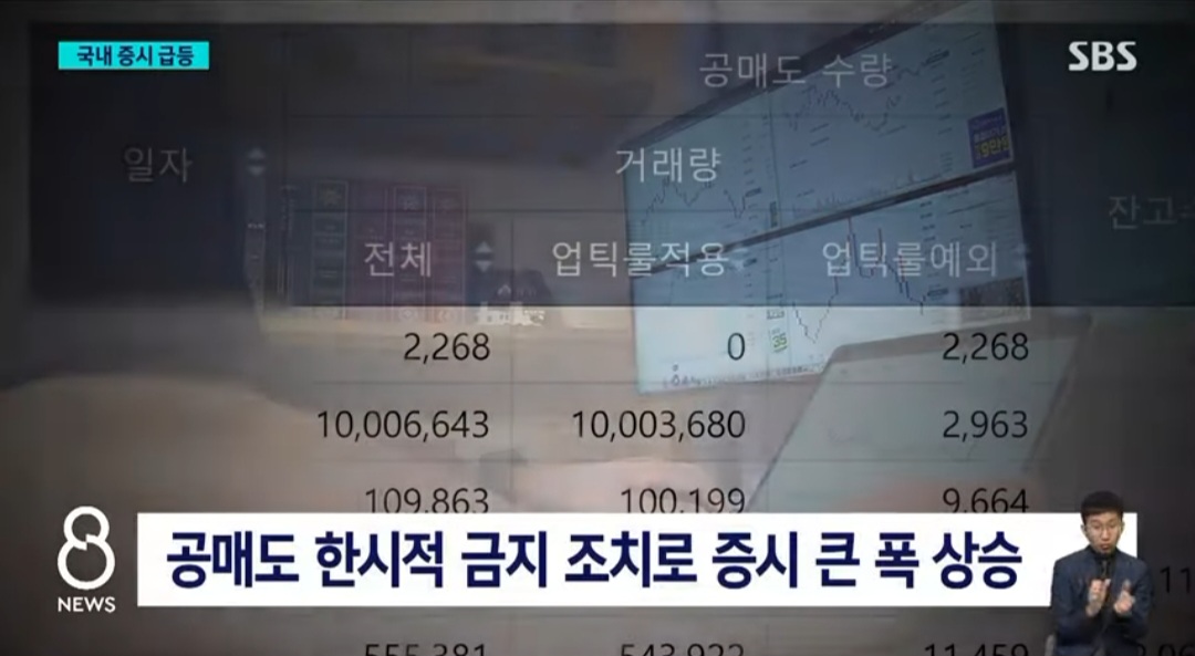 정부가 공매도를 내년 6월말까지 한시적으로 전면 금지한 첫날 국내 증시가 급등했습니다.