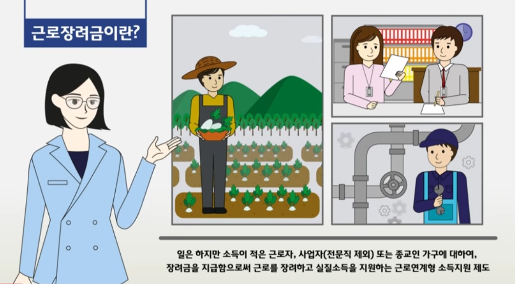 근로장려금은 일은 하지만 소득이 적어 생활이 어려운 근로자, 종교인, 사업자(전문직 제외)가구에 대하여 가구원 구성과 근로소득, 사업소득 또는 종교인소득에 따라 산정하여 지급하는 근로연계형 소득지원 제도입니다.
