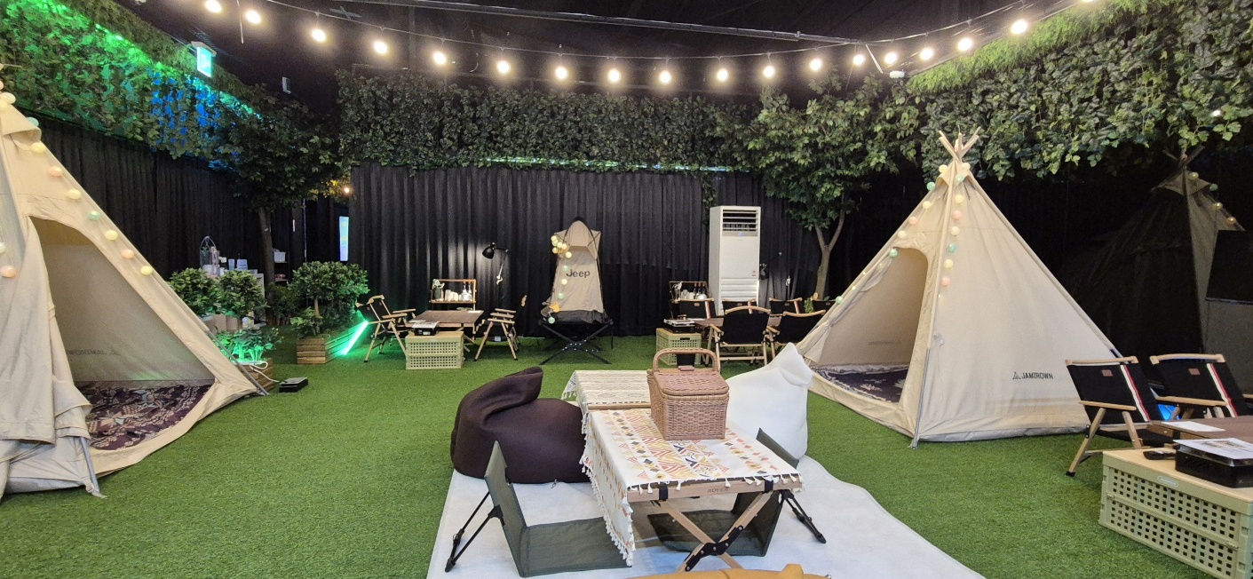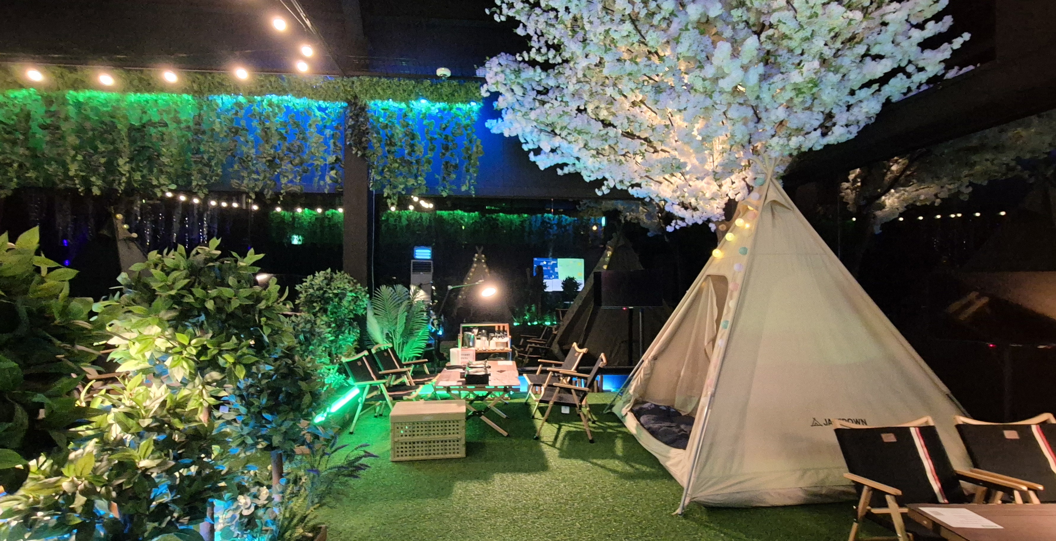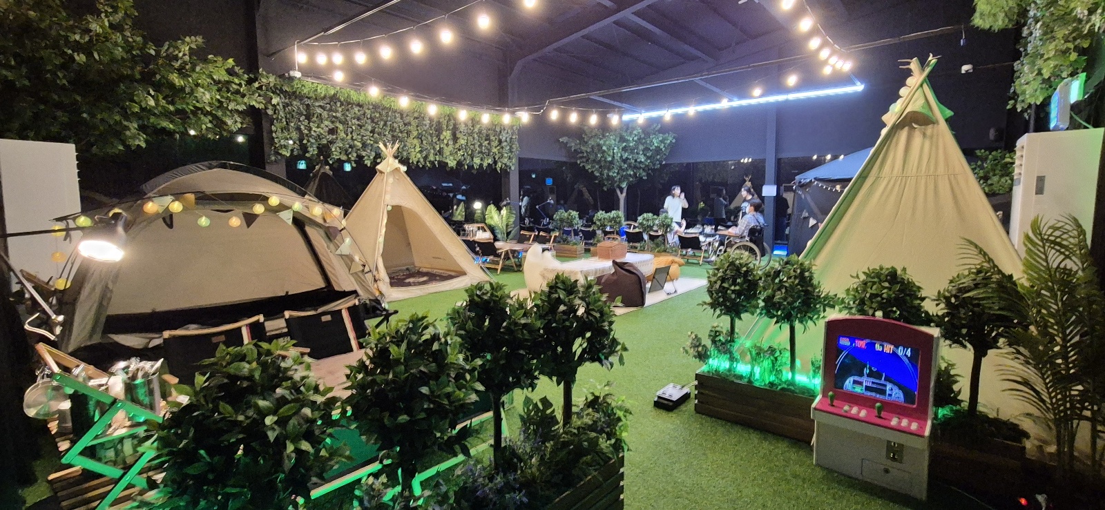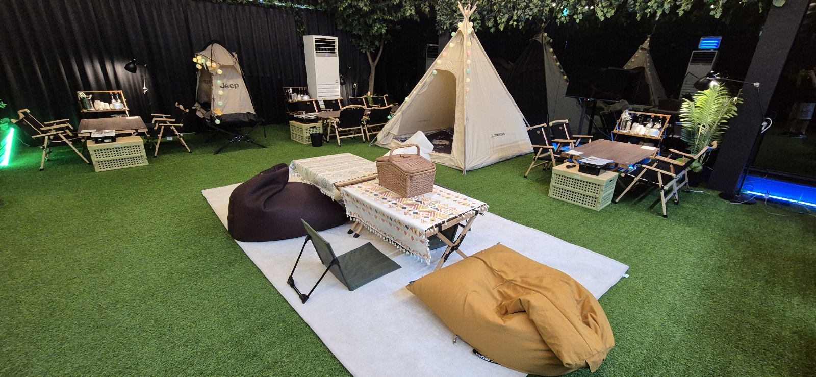 조명과 텐트, 아기자기한 소품들이 조화를 이루며, ‘진짜 캠핑’을 떠난 듯한 분위기를 연출합니다. 포근한 매트와 이불이 제공되는 스팟도 있어 캠핑 중간에 잠깐 낮잠을 즐기기에도 좋습니다.