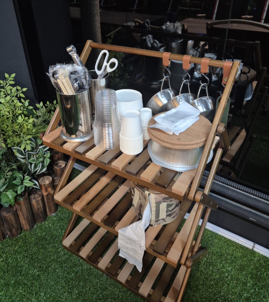 각 스팟에는 일회용 냄비, 수저, 컵, 접시 등 기본적인 조리도구가 세팅되어 있으며, 전자레인지와 온수기, 추가 조리도구는 2층 주방에서 자유롭게 이용할 수 있습니다.