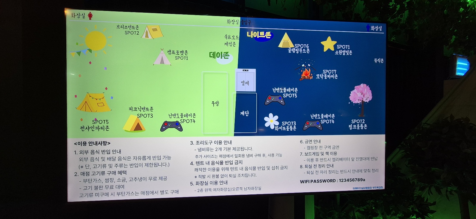 각 테이블은 번호가 붙은 ‘스팟’으로 운영되며, 예약 시 닌텐도존, 보드게임존, 불멍존 등 다양한 테마의 공간을 선택할 수 있습니다. 프라이빗한 공간이 확보되어 있어 소규모 모임에도 적합합니다.