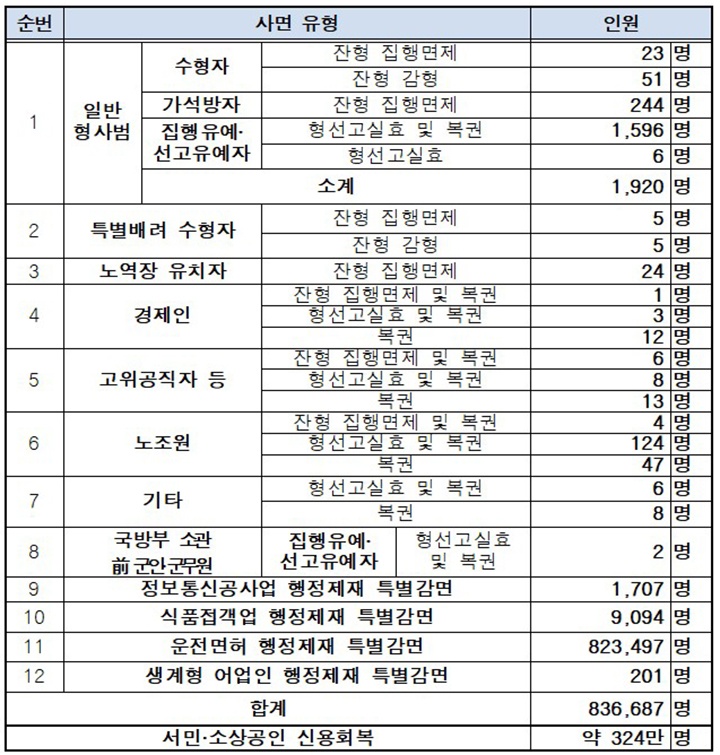 이번 특별사면은 형사범 사면 외에도 다양한 행정제재 감면 조치를 포함하고 있어요. 그 규모가 무려 83만 4,499명에 달한다고 합니다. 특히 민생경제에 온기를 불어넣기 위한 조치들이 눈에 띄는데요.