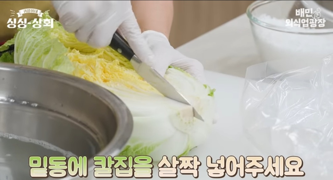 (반으로 자른 배추 밑둥에 칼집을 내는 것이 팁입니다 그래야 소금물이 잘 들어가서 골고루 절여집니다)