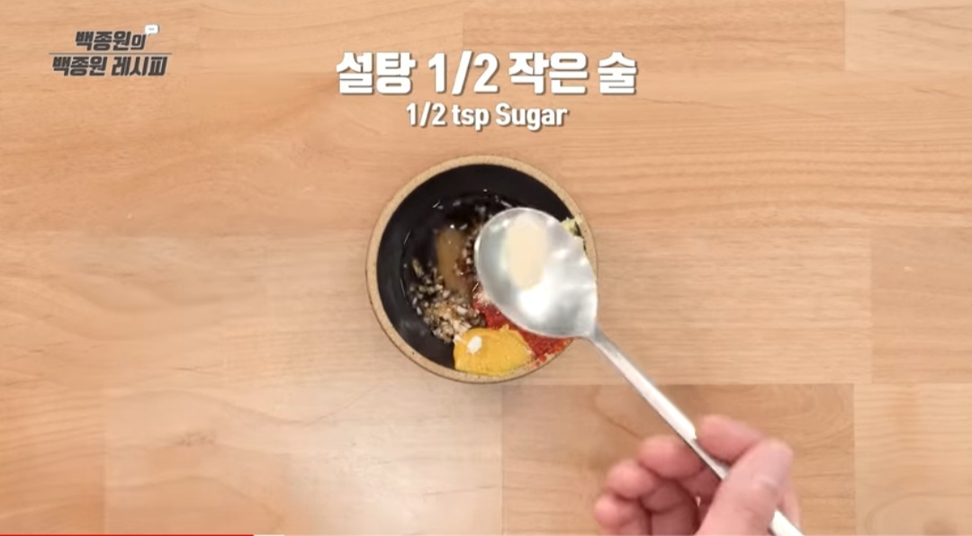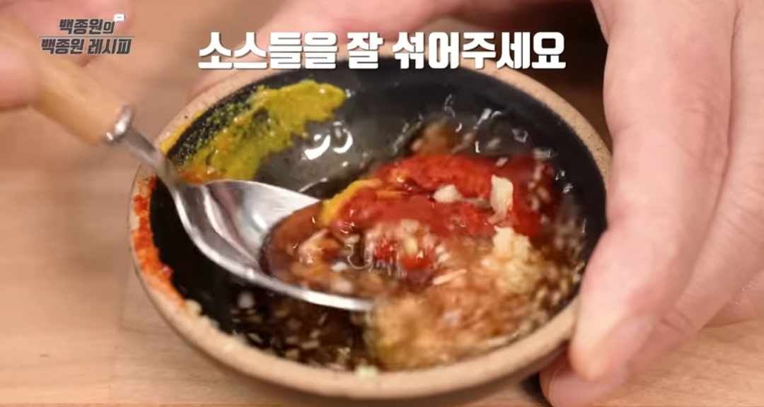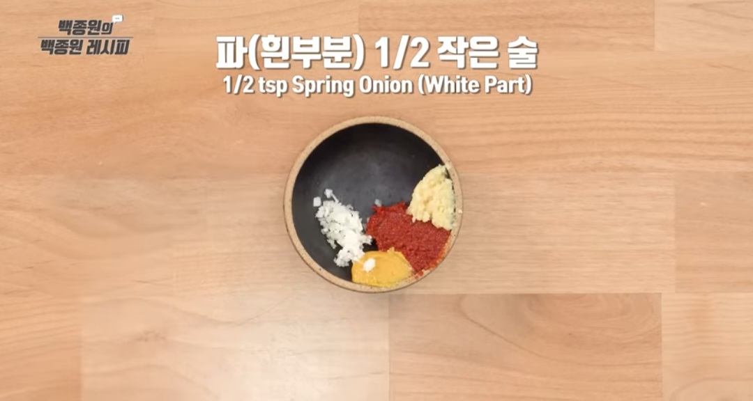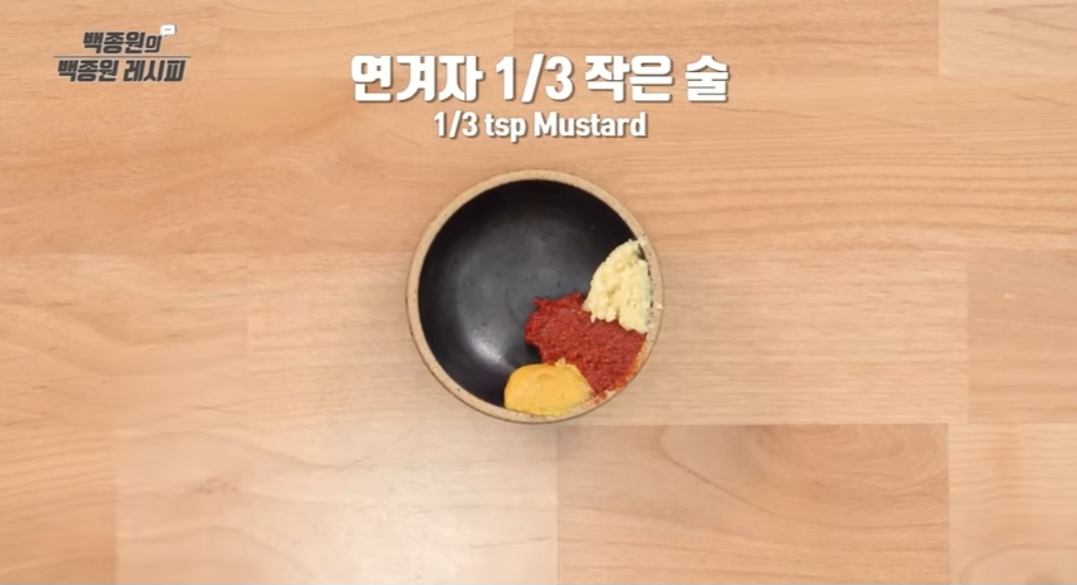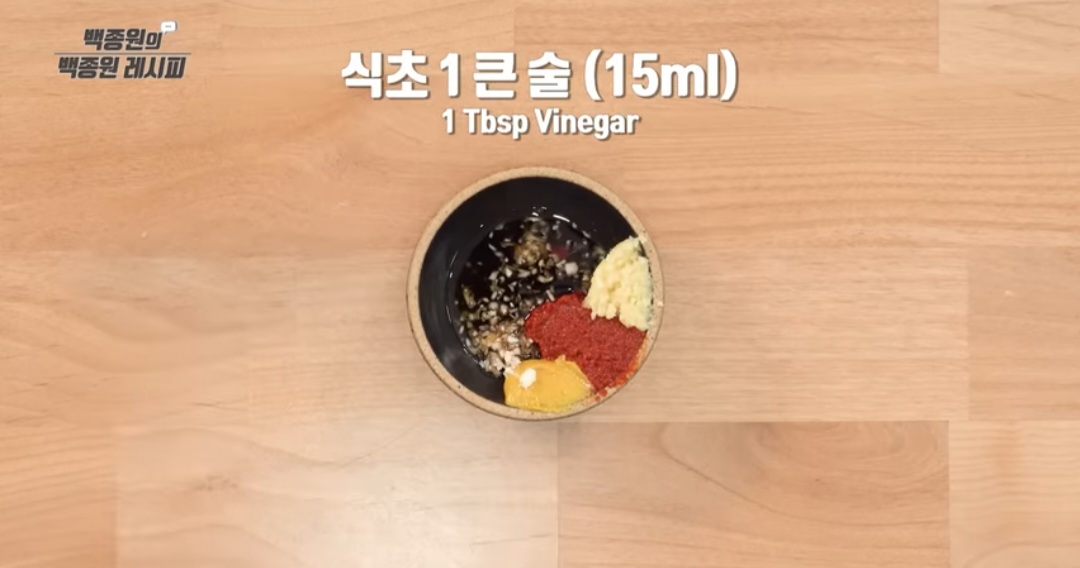 - 파 1/2 작은술, 연겨자 1/3 작은술, 식초 1 큰술, 설탕 1/2 작은술, 진간장 2 큰술 등을 넣고 잘 섞어 줍니다