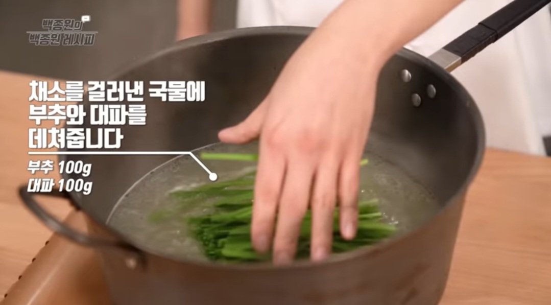 - 채소를 건져낸 육수에 부추와 대파를 데쳐서 닭 위에 올립니다
