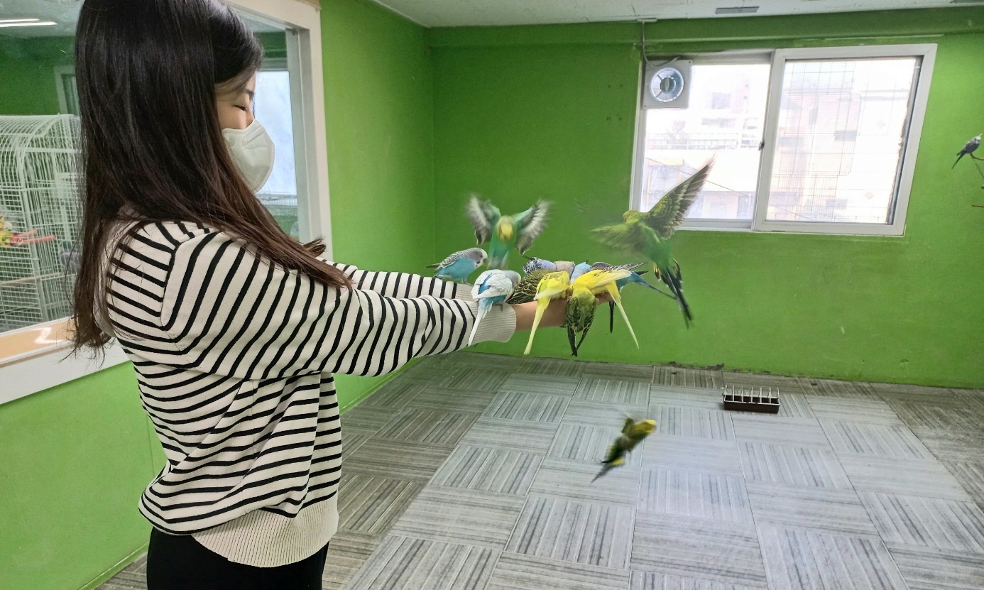 손바닥위에 모이를 놓으면 앵무새들이 와서 먹습니다 갑자기 많은 앵무새들이 모인다고 놀라지 마세요 ㅋㅋ