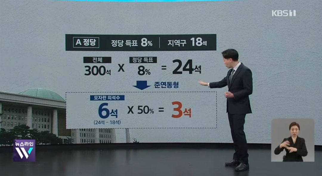 따라서 모자란 의석수인 6석의 50% 3석을 '준연동형 비례대표' 의석으로 a 정당에 적용하는 것이 준연동형 비례대표제입니다