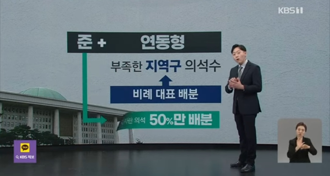 지역구 의석과 비례의석을 연동해서 지역구에서 덜 얻게 된 의석을 정당 득표율을 기준으로 해서 비례의석으로 채워주는 방식을 연동형 비례대표제라고 합니다