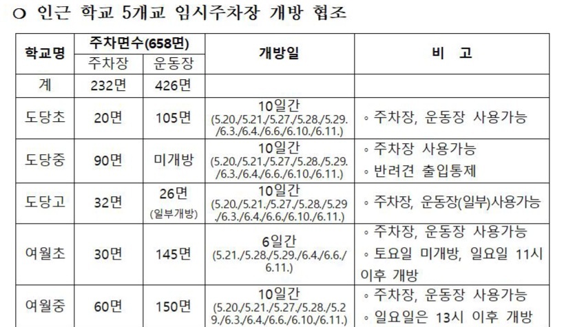 1)주말과 공휴일에는 인근 학교 5개교에 임시주차장을 운영하고 있습니다