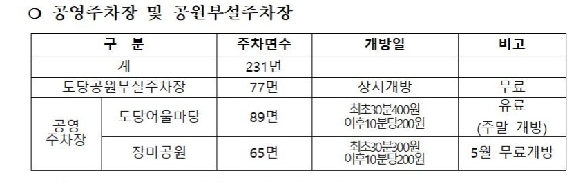 2)공원에도 공영주차장 2개소(장미공원 공영주차장, 도당어울마당)가 운영되고 있으나 여기는 운이 좋아야 주차하실 수 있답니다
