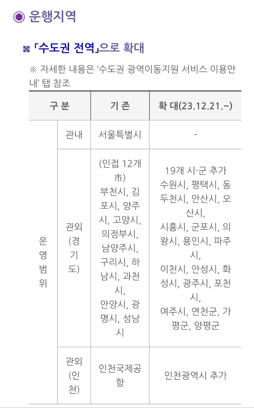 가장 궁금해하실 운행 지역은 수도권 전역으로 확대되었어요. 기존에는 서울시 내와 인접 12개 시에 한정되었지만, 2023년 12월 21일부터 수원, 용인, 평택, 이천 등 19개 시군과 인천광역시 전역(인천공항 제외)으로 확대 운행되고 있습니다.