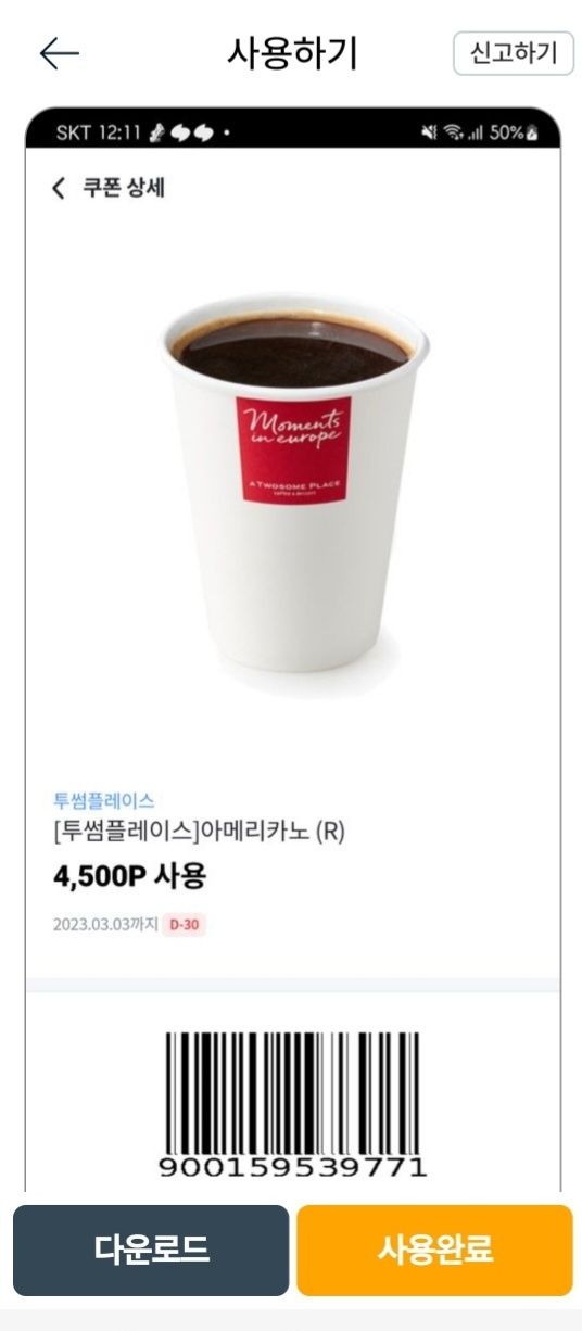 3.10% 할인하는 투썸플레이스 커피 상품권중 하나를 선택합니다
