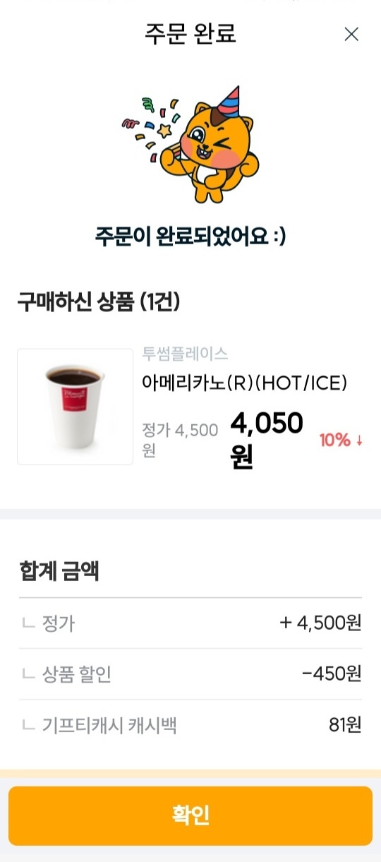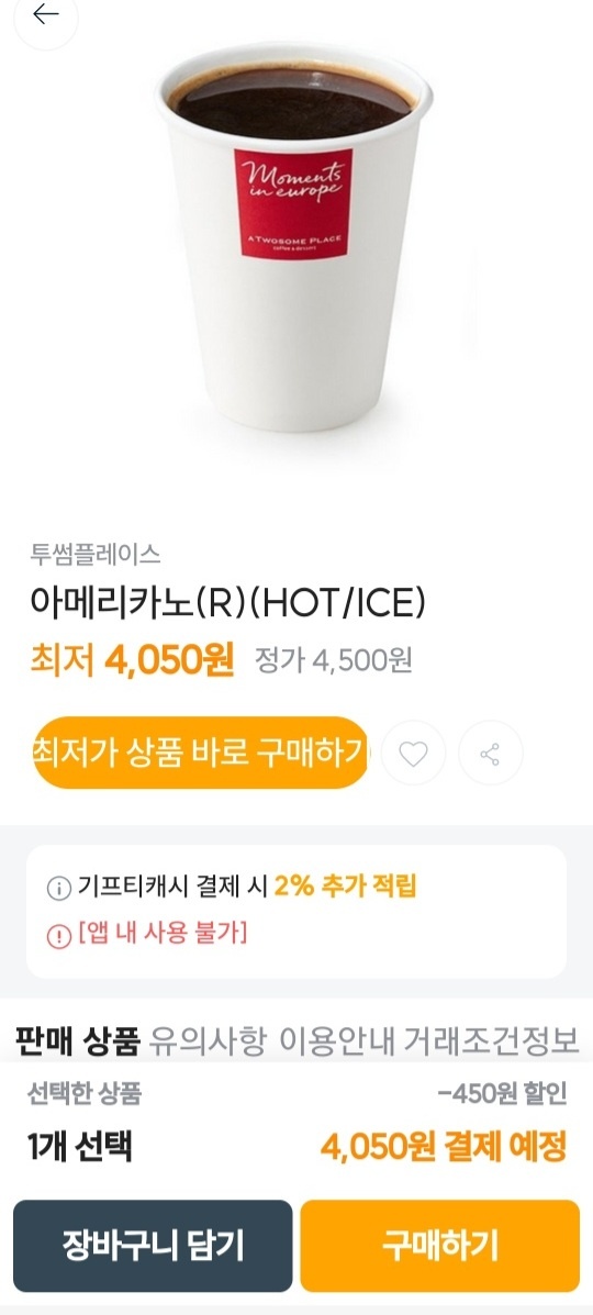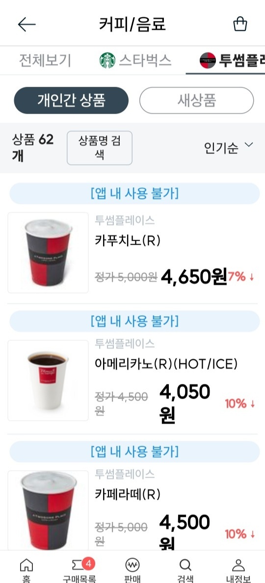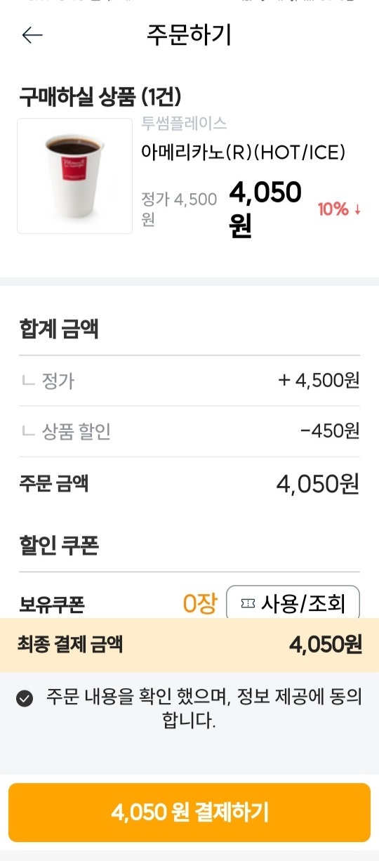 저는 투썸플레이스 커피를 선택하겠습니다 아메리카노가 10% 할인가로 판매되네요