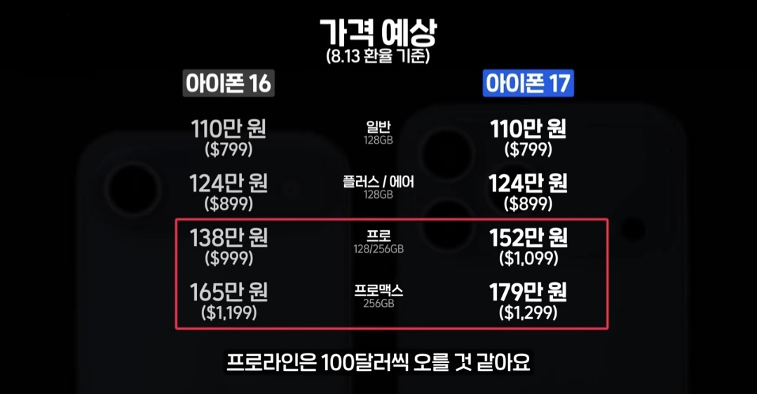 • 아이폰 17 (기본형): 799달러 (약 110만 원)부터 시작