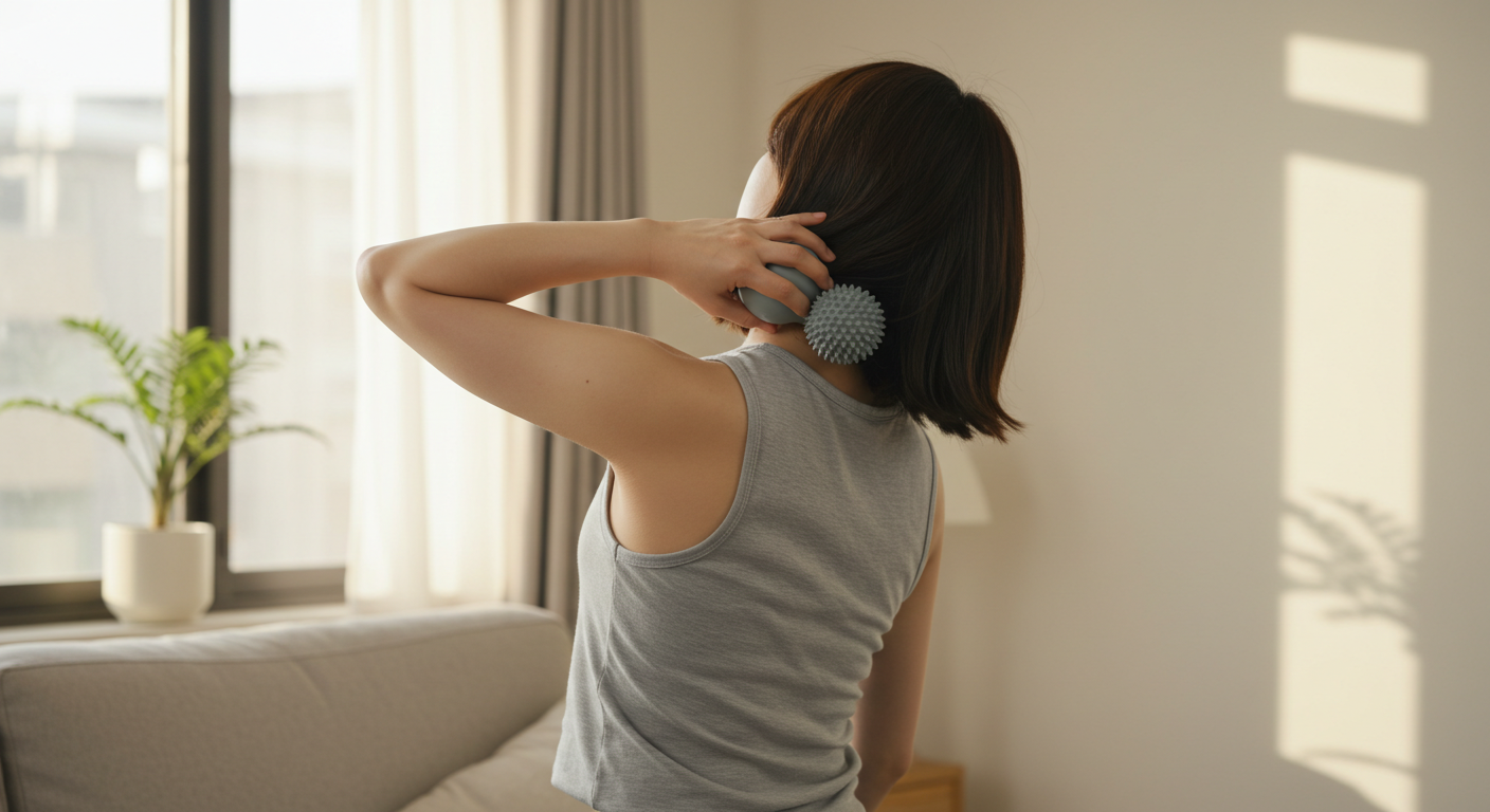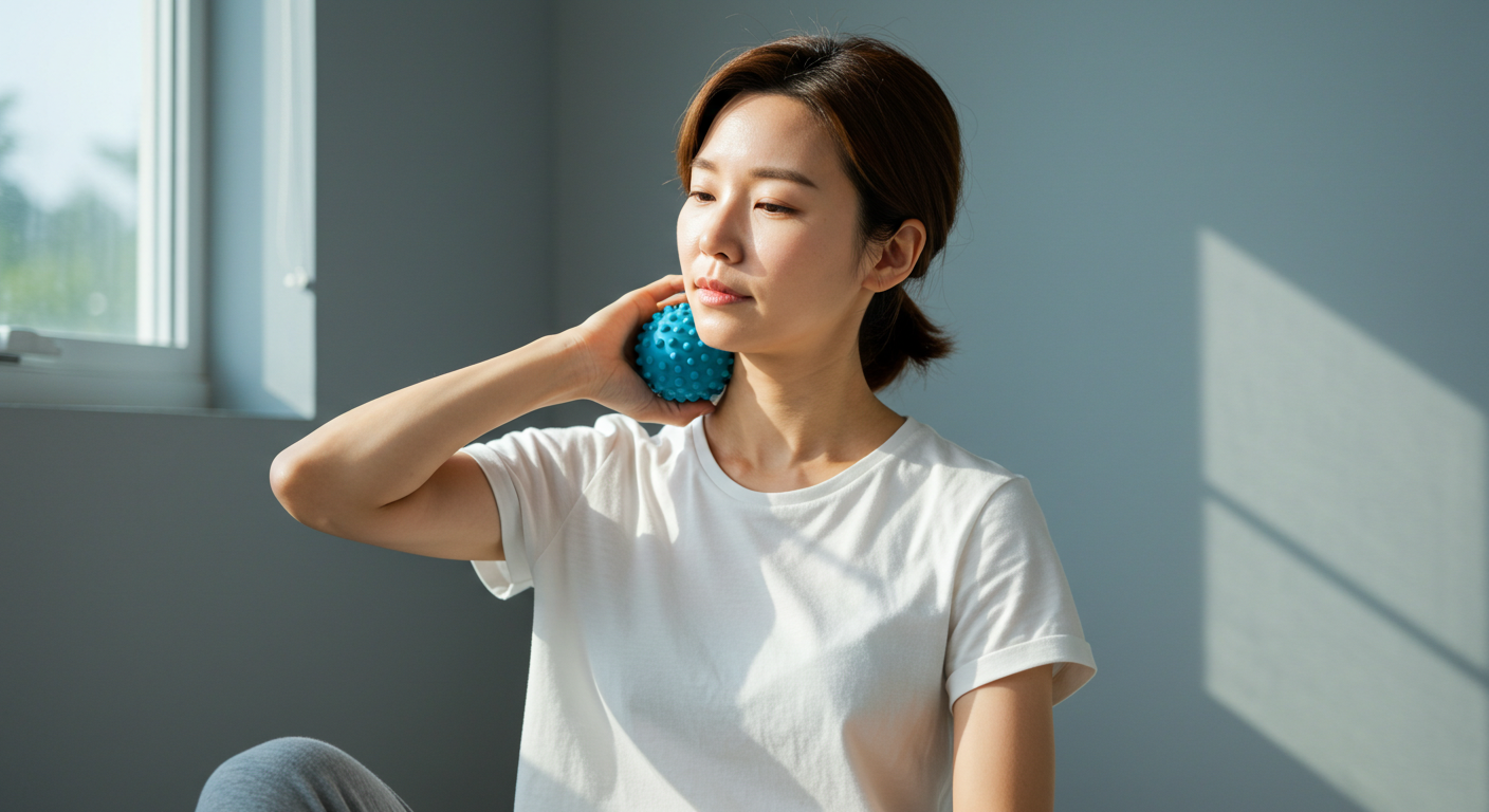 손으로 직접 누르기보다는 폼롤러나 마사지볼을 활용하는 것이 근육의 압박을 줄이며 효과적입니다. 목 옆보다 어깨 윗부분을 중심으로 부드럽게 압박하면서 마사지해줍니다. 마사지 도중 통증이 심하면 즉시 중단합니다.