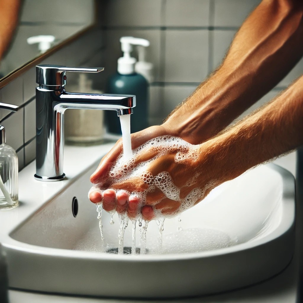 - 외출 후, 식사 전, 조리 전후에 비누와 물로 30초 이상 손을 깨끗이 씻습니다.