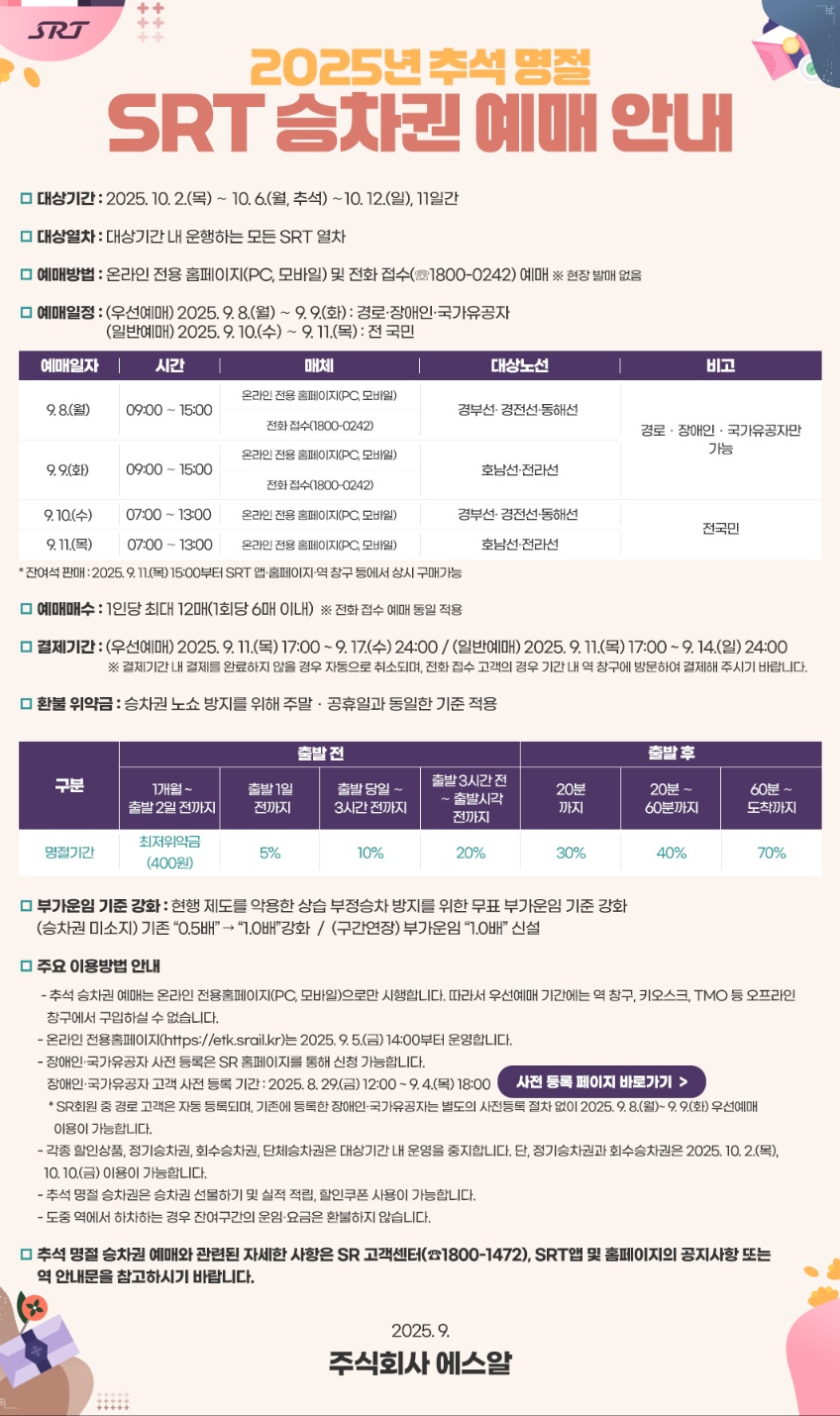 2025 추석 기차표 코레일 KTX / SRT 예매 일정 및 예매 바로가기, 필승 성공 팁