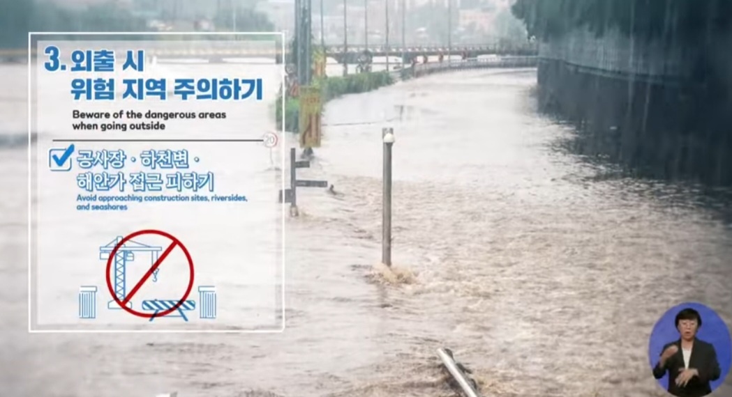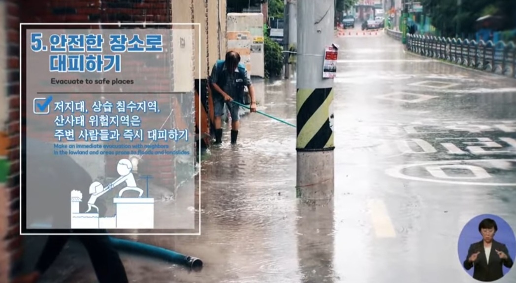 - 상습 침수 지역, 산사태 위험 지역에서는 주변 사람들과 함께 대피합니다
