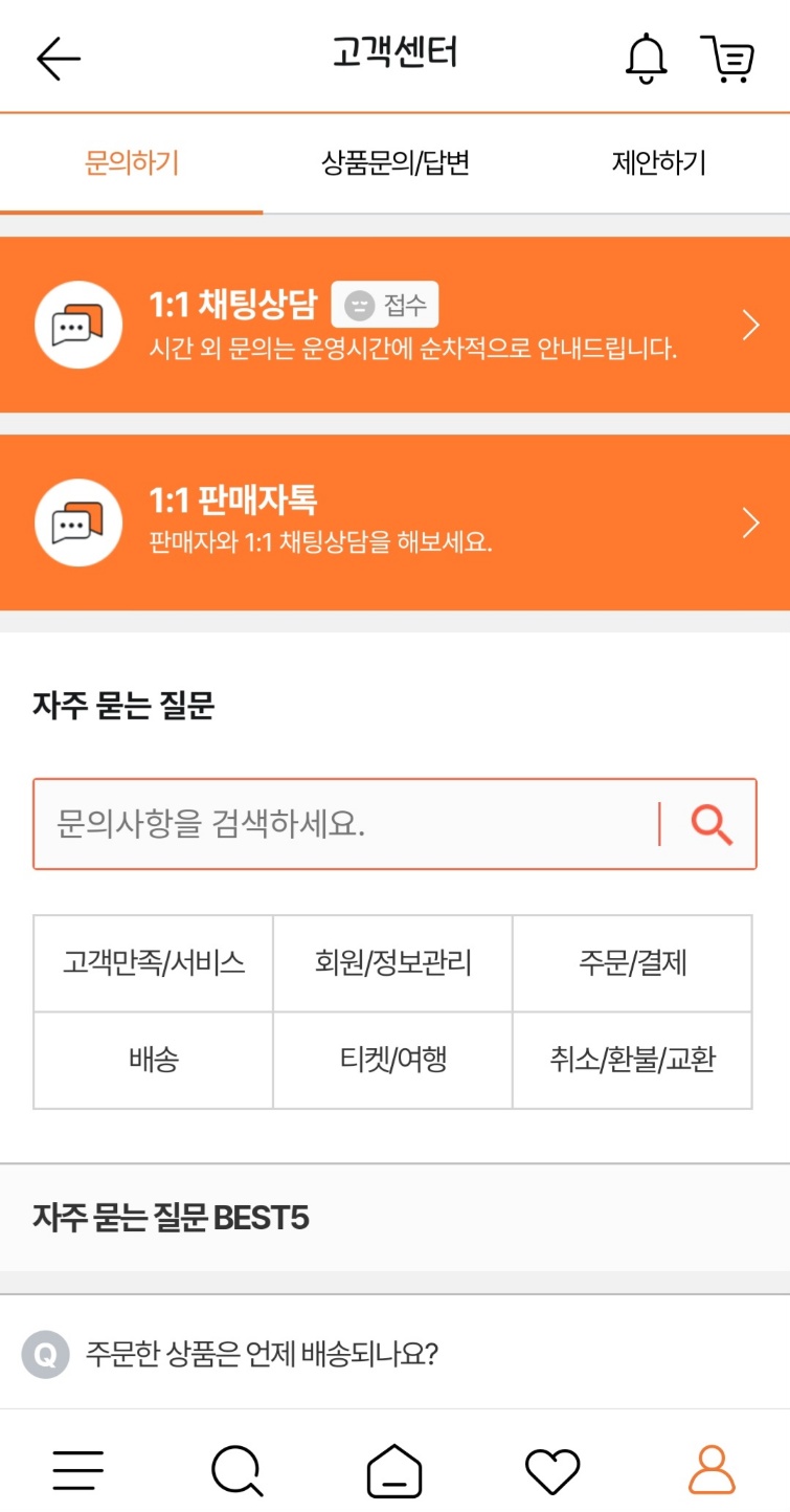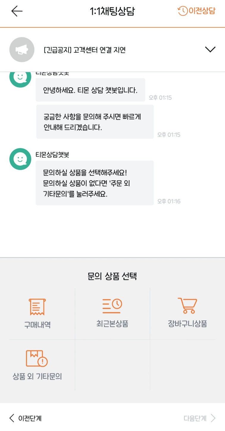 티몬 앱의 '마이티몬' 메뉴를 이용하면 1:1 채팅상담 서비스를 제공받을 수 있습니다. 모바일 앱을 통해서 간단한 문제는 해결해 보세요