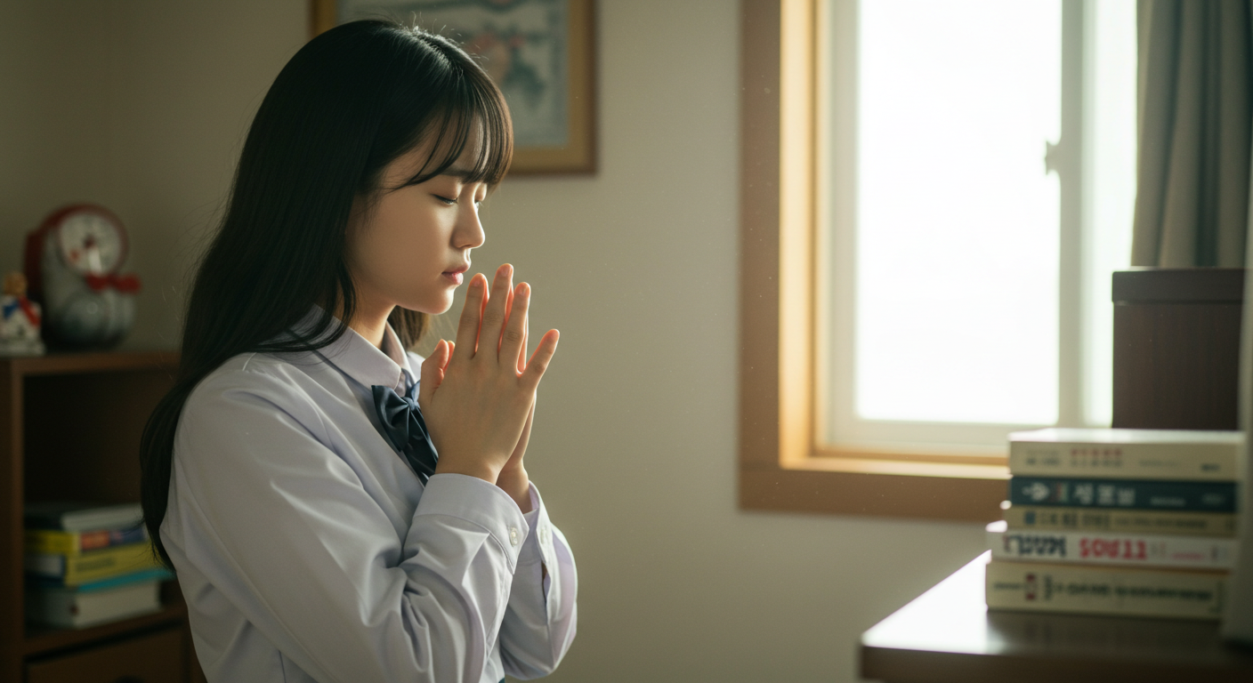 “하나님, 내일은 수능입니다. 오늘 밤 편안한 잠을 잘 수 있도록 도와주세요. 시험 당일, 몸도 마음도 건강하게 시험장에 들어가게 해주세요. 제 안에 있는 힘을 다 쏟아낼 수 있도록 도와주세요. 결과와 상관없이, 후회 없이 시험을 마무리할 수 있게 해주세요.”