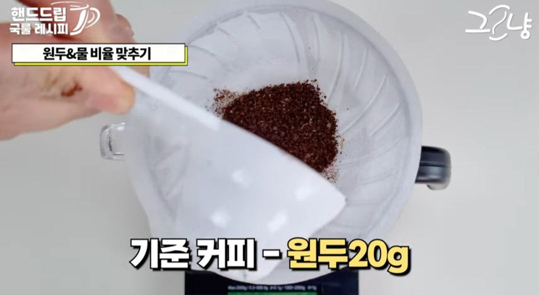 3.드립포트에 물을 넣고 저울을 이용하여 1인분 기준으로 20g의 원두를 넣습니다.