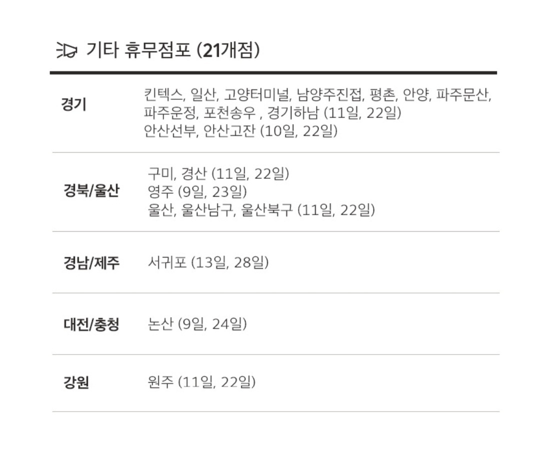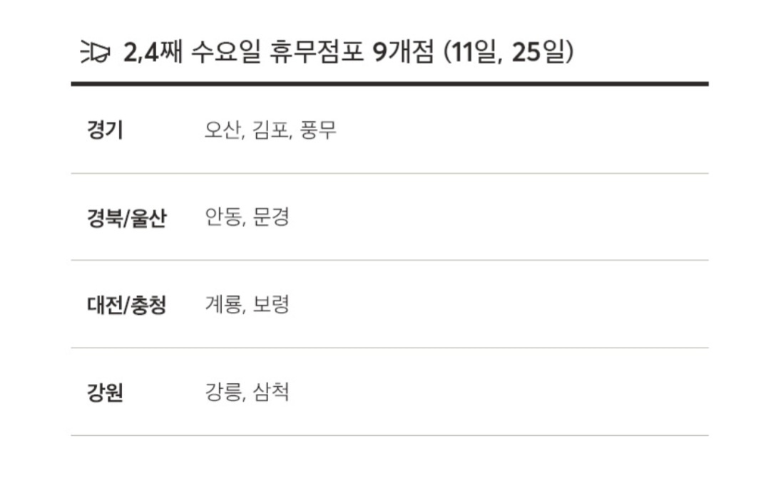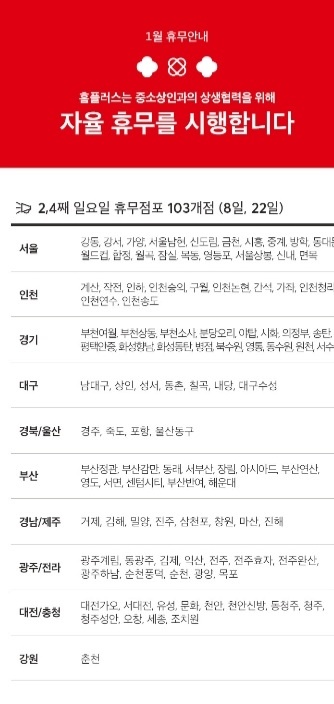 2,4주 수요일 휴무점포(9개점)와 기타 휴무점포(21개점)를 제외한 103개 전국 점포는 8일(주일), 22일(설 당일) 휴무점포입니다