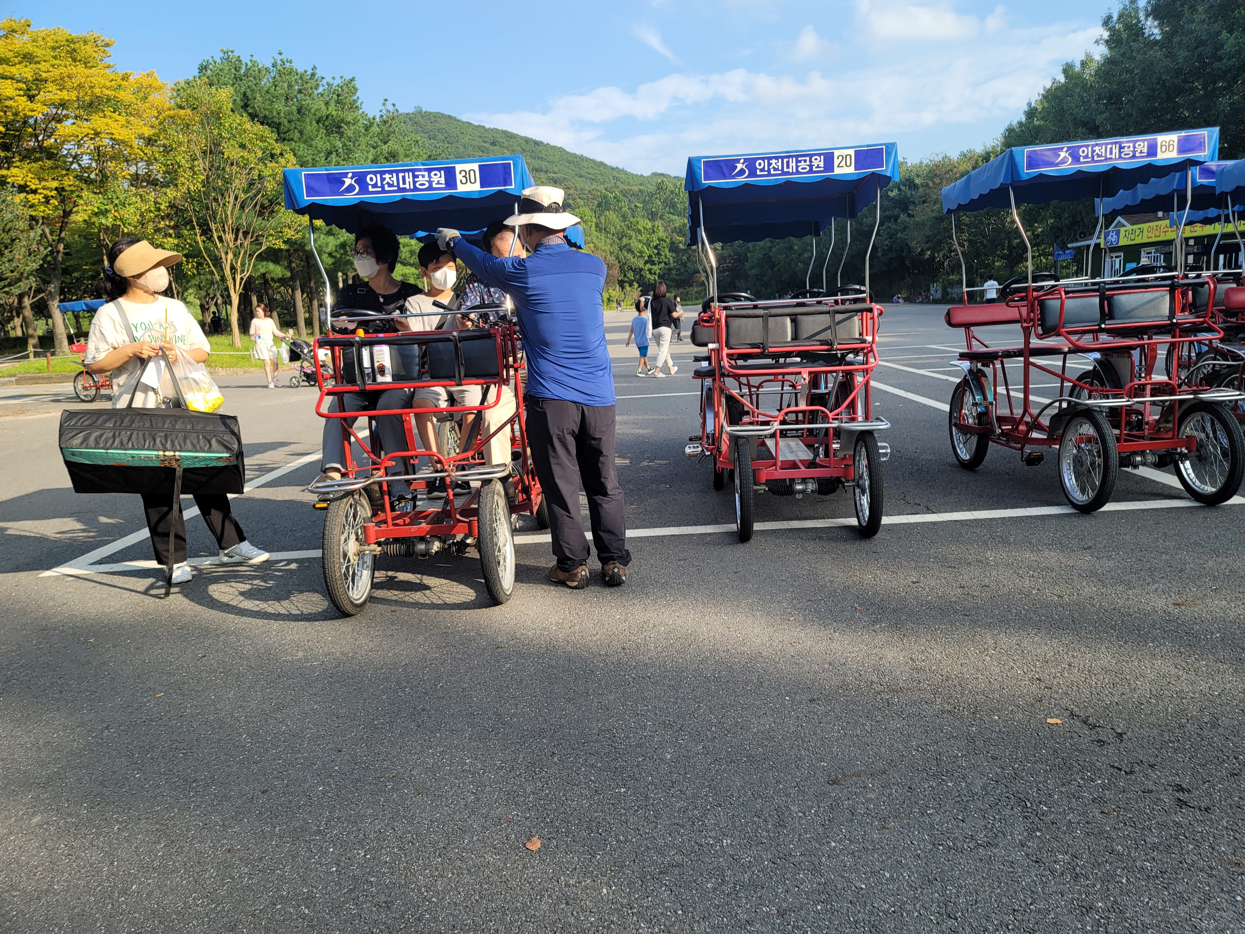 인천대공원은 자전거가 잘 다닐 수 있도록 도로가 잘 되어 있습니다 가보시면 자전거를 이용하는 사람들을 많이 볼 수 있는데요 특히 다인용 자전거가 인기가 있습니다 가족끼리 연인끼리 다 함께 타실 수 있구요 입구쪽 자전거 대여소가 있으며 가격은 다인용은 10,000원, 개인용은 2,000원입니다 시간은 기본 1시간이구요 초과하면 10분당 초과금액이 있으니 참고하세요