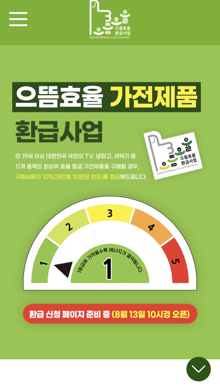 으뜸효율가전 환급 사업은 다음 주 8월 13일 수요일 오전 10시부터 신청이 시작돼요. 이미 오프라인 매장에서도 이 지원사업에 대해 안내를 해주고 있을 거예요.