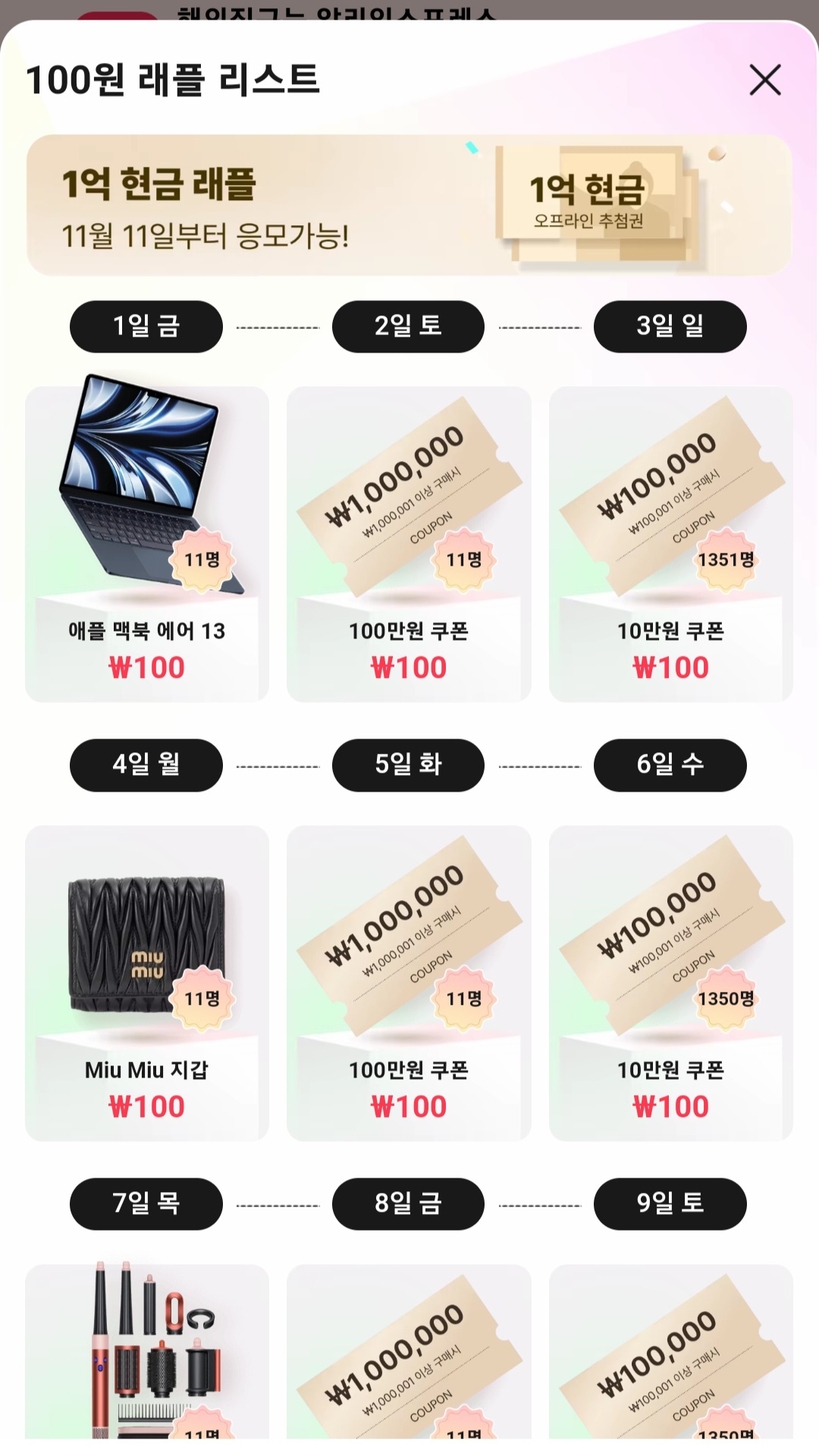 1. 알리익스프레스: 최대 50% 할인을 제공하며, 일정 금액 이상 구매 시 추가 할인을 받을 수 있는 할인 코드를 지원합니다. 단 100원으로 1억 원을 노릴 수 있는 특별 래플 이벤트도 광군제의 대표적인 행사입니다.