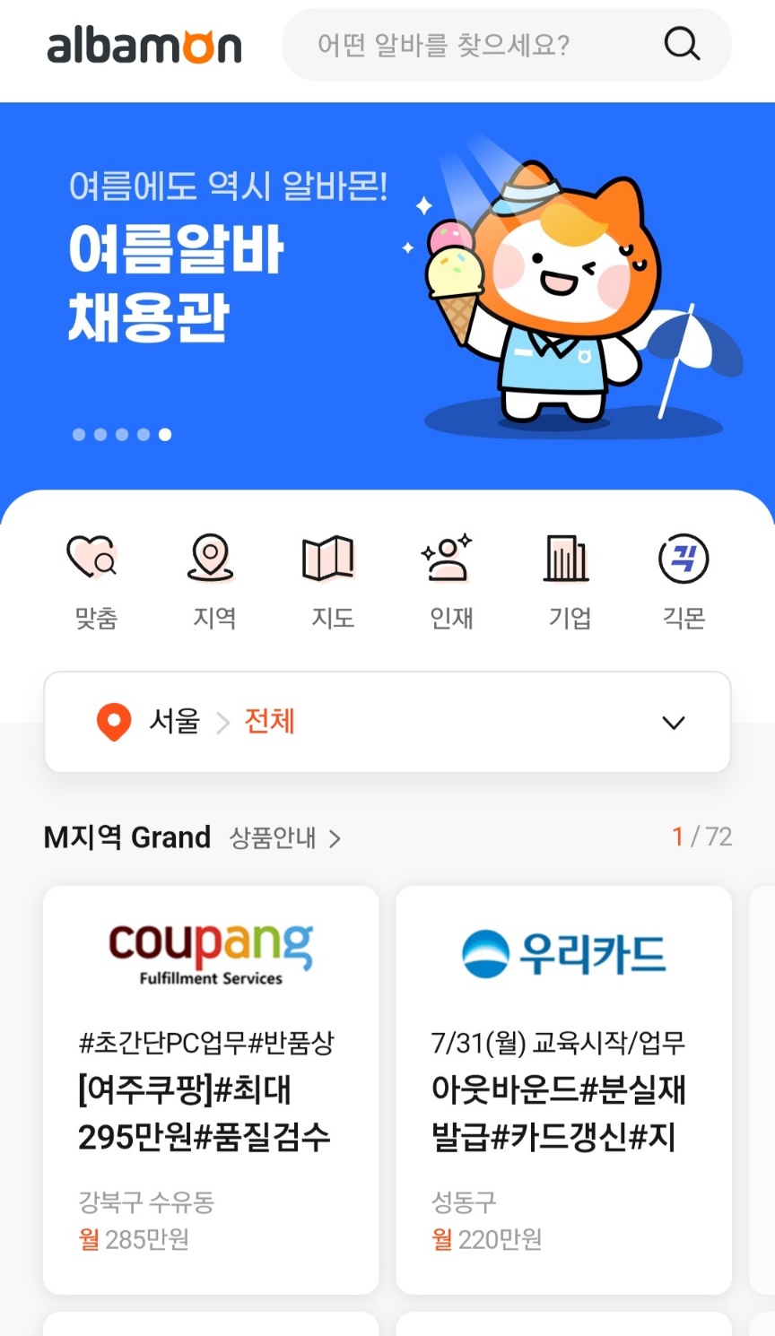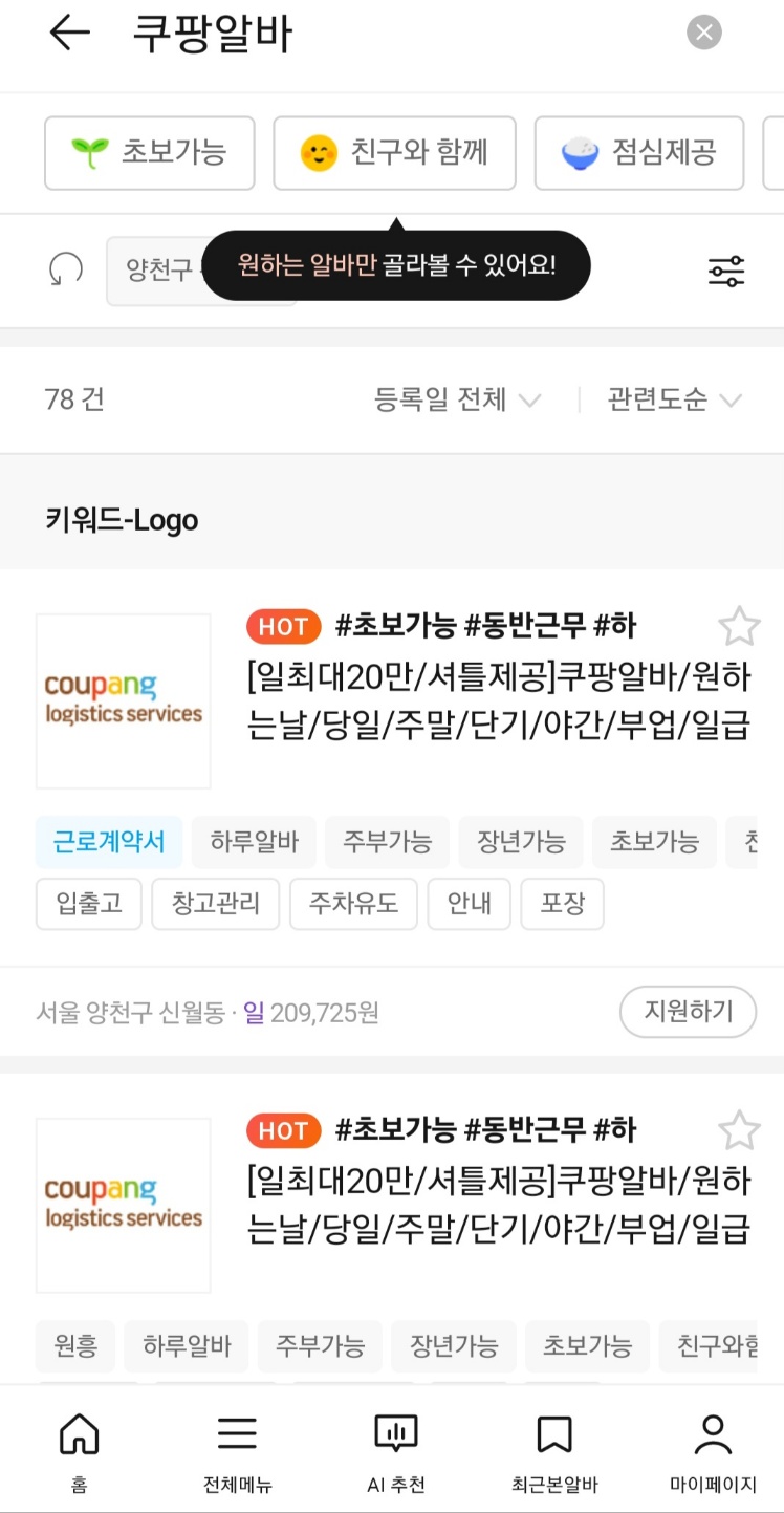 알바몬이나 알바천국 웹사이트에 접속한 후, '쿠팡알바'로 검색하여 원하는 지역과 센터를 지원합니다