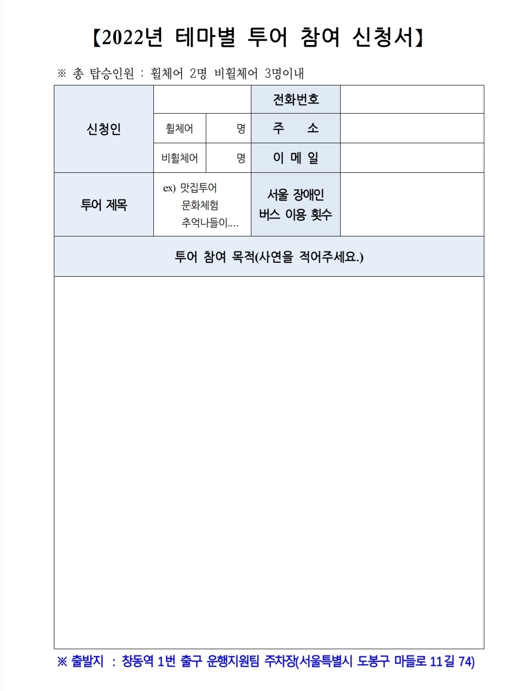 테마투어는 서울시장애인콜택시 이용고객분들께서 직접 계획한 투어 내용을 공단에 제출하고 서울시시설공단에서는 무료로 운행버스를 고객에게 제공해드리는 서비스입니다