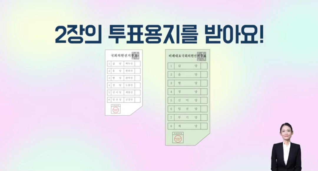 투표용지는 총2장이며 한 장은 (1)우리 지역 국회의원을 뽑는 투표용지이고 (2)한 장은 비례대표를 뽑는 투표용지입니다
