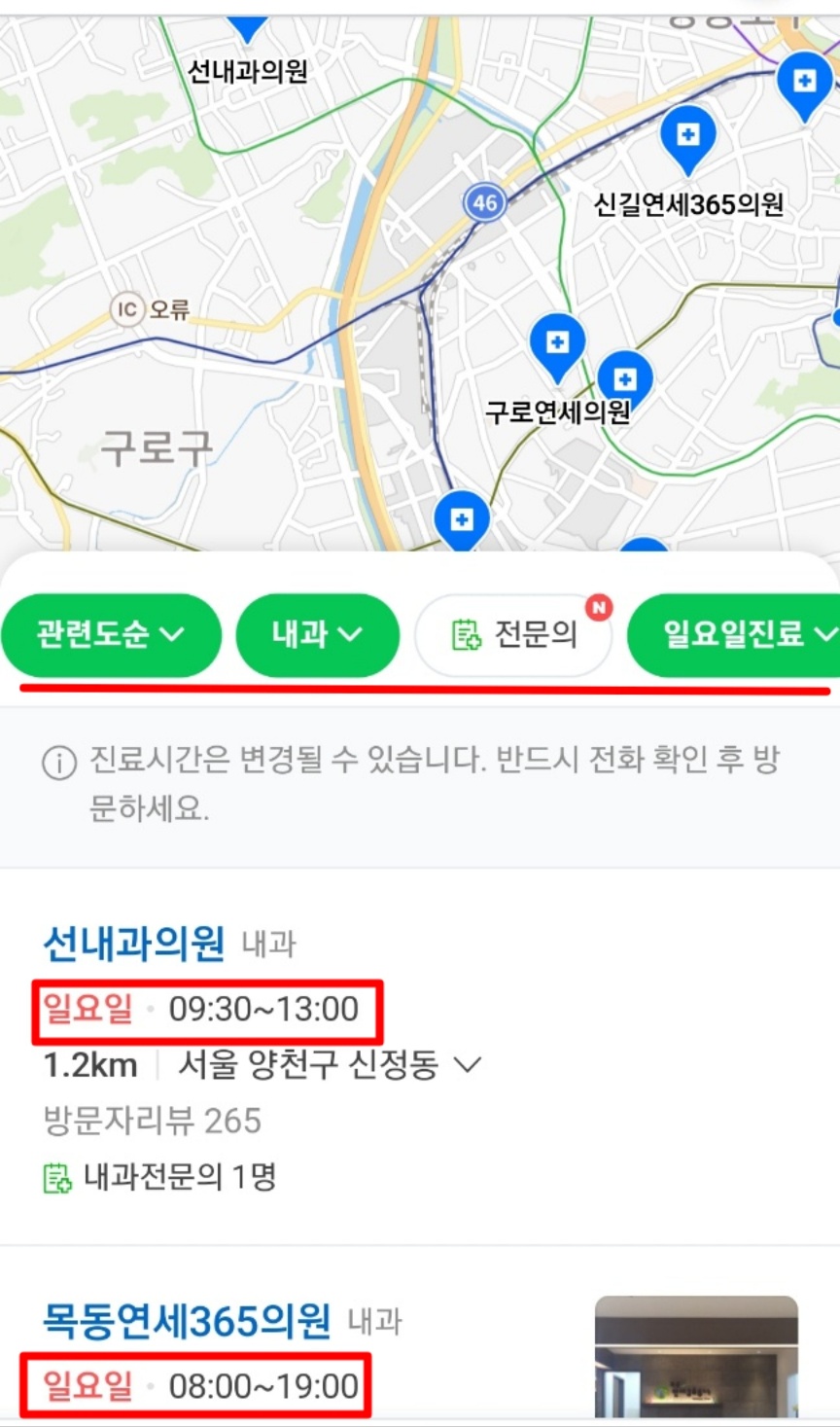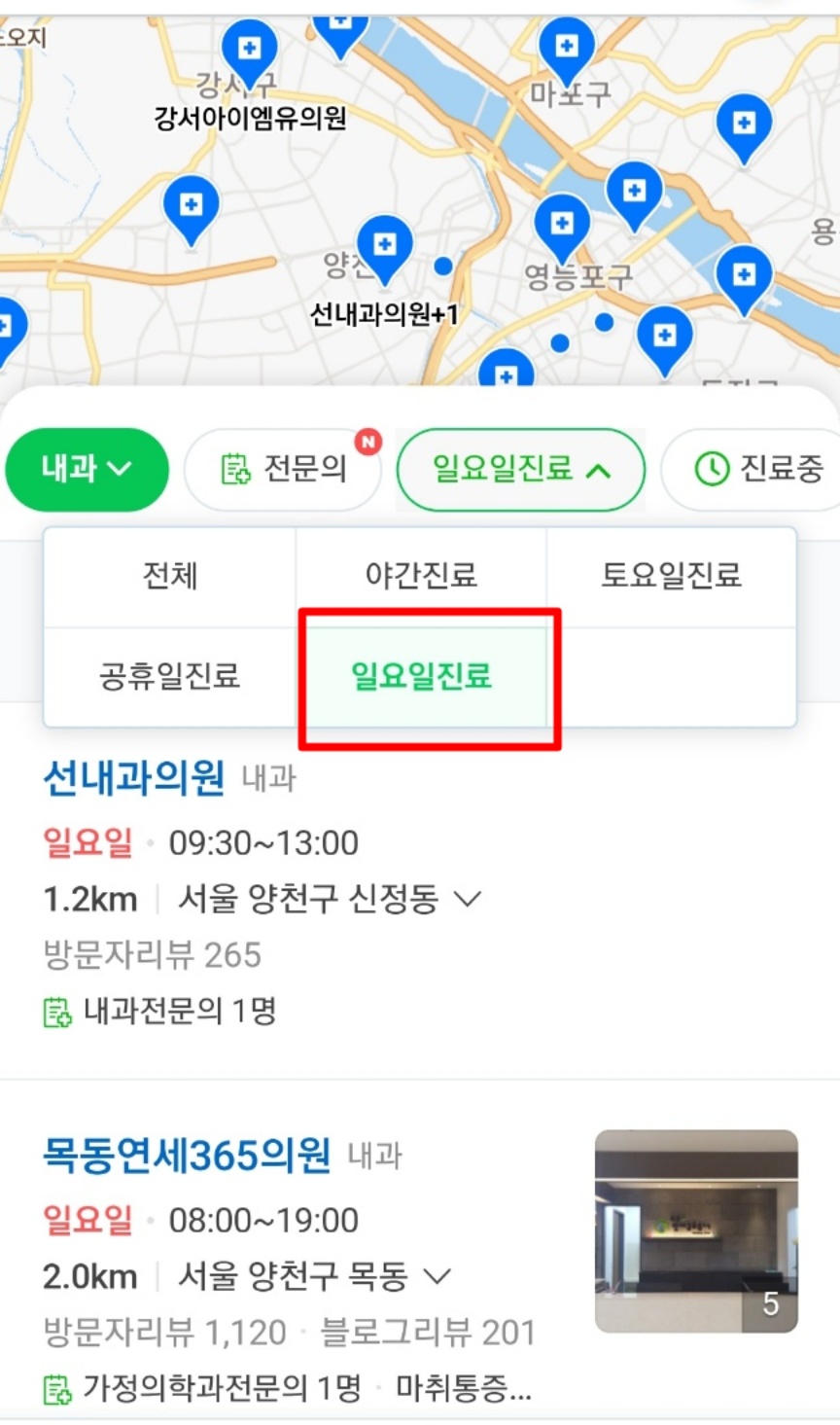 4.원하는 주일(일요일) 내과 진료가 검색됩니다