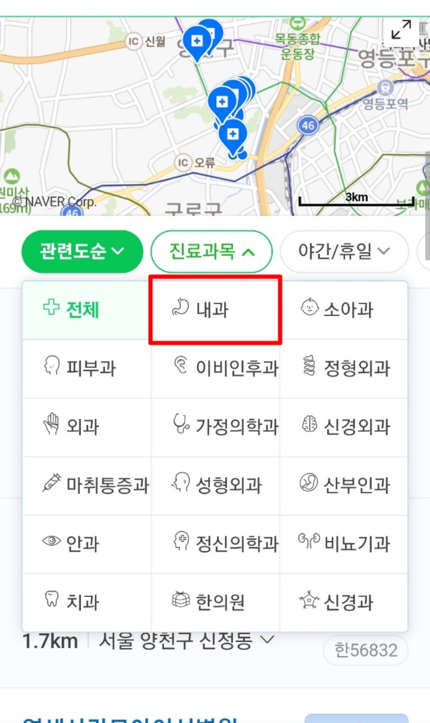 2.지도 밑에 '조건 검색' 중에 원하는 진료과목을 선택합니다