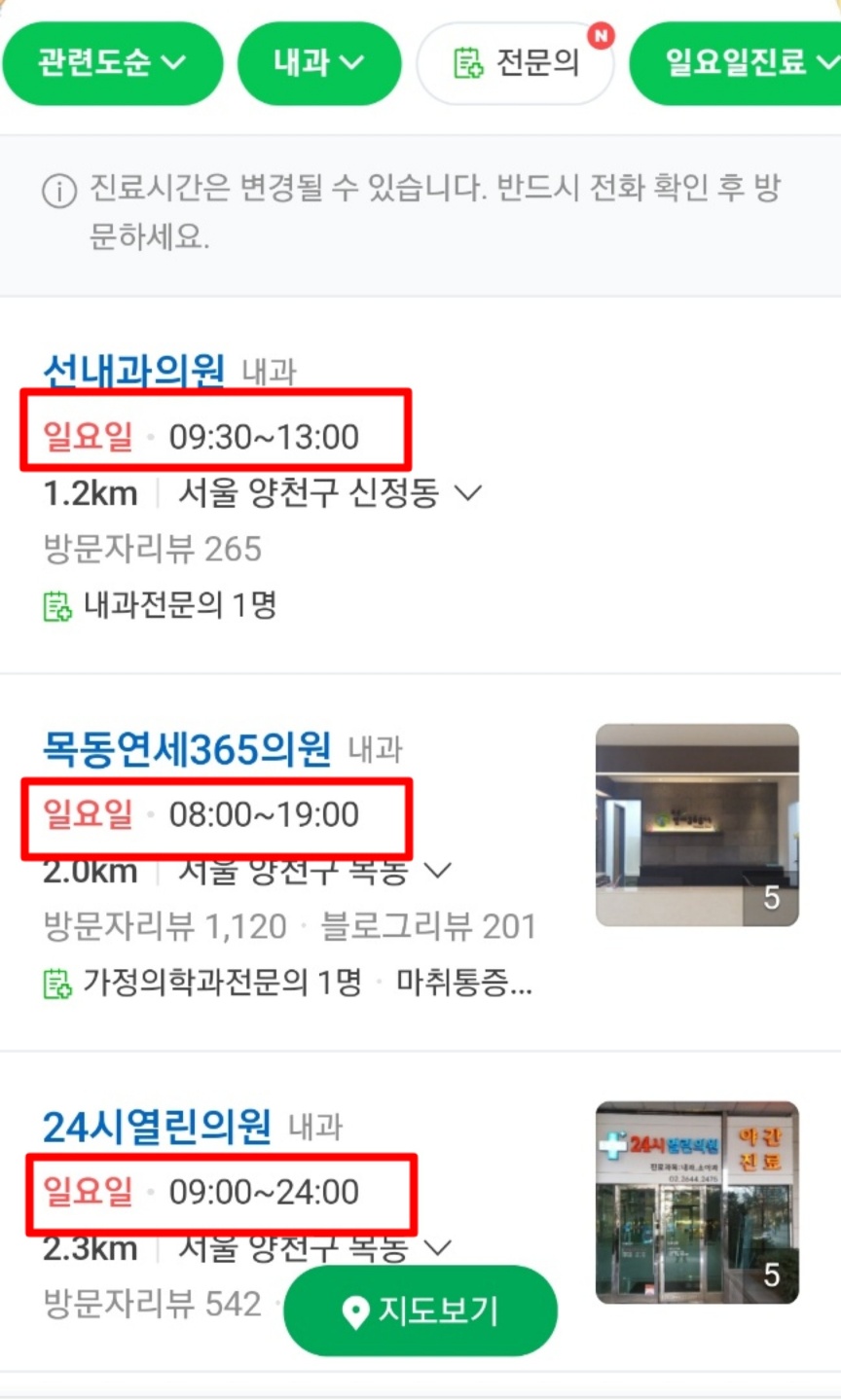 주일진료(일요일) 검색했더니 다양한 시간대가 나옵니다
