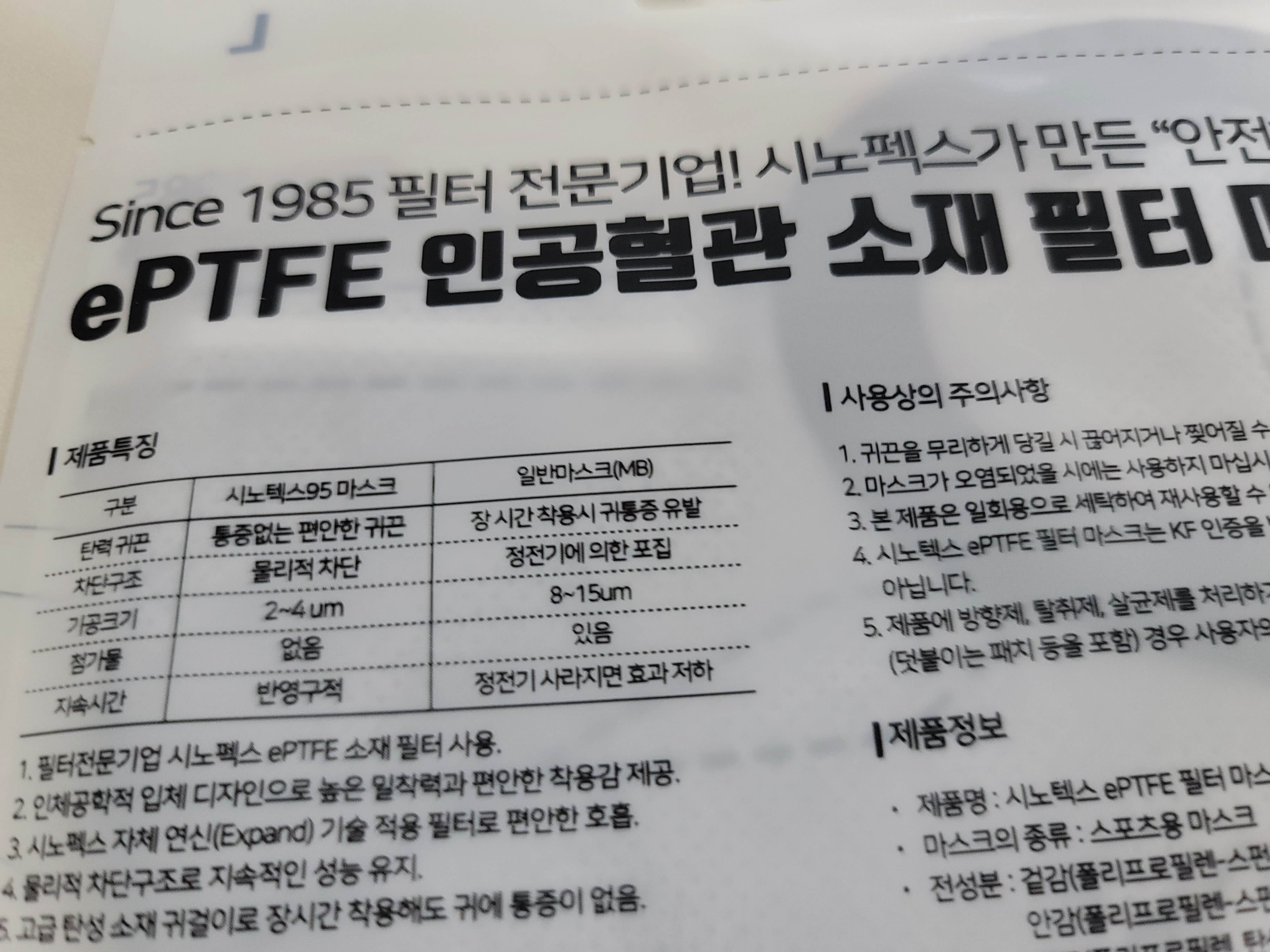 그래서 선택한 시노펙스 여름용 프리미엄 새부리마스크. 인공혈관 소재 필터 마스크로 Since 1985년 필터만 전문으로 제작한 시노펙스에서 만들었다니 더 신뢰가 가더라구요