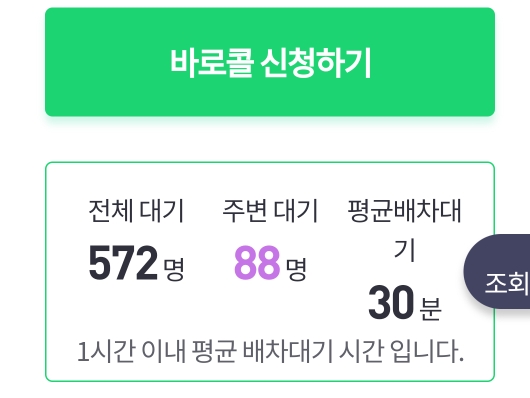 앱 첫 화면을 보시면 전체대기, 주변대기, 평균배차대기 이렇게 3가지가 보입니다